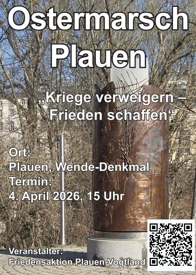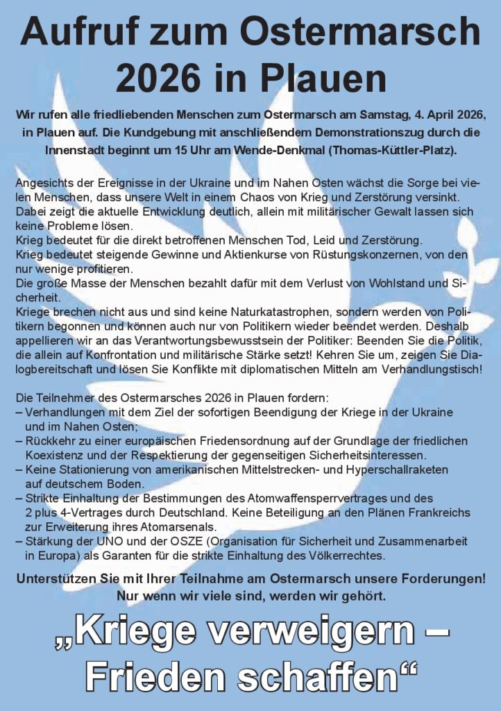 16 engagierte Bürgerinnen und Bürger haben sich in der Friedensaktion-Plauen-Vogtland zusammen gefunden. Die Zugehörigkeit zu politischen Parteien spielt dabei keine Rolle.